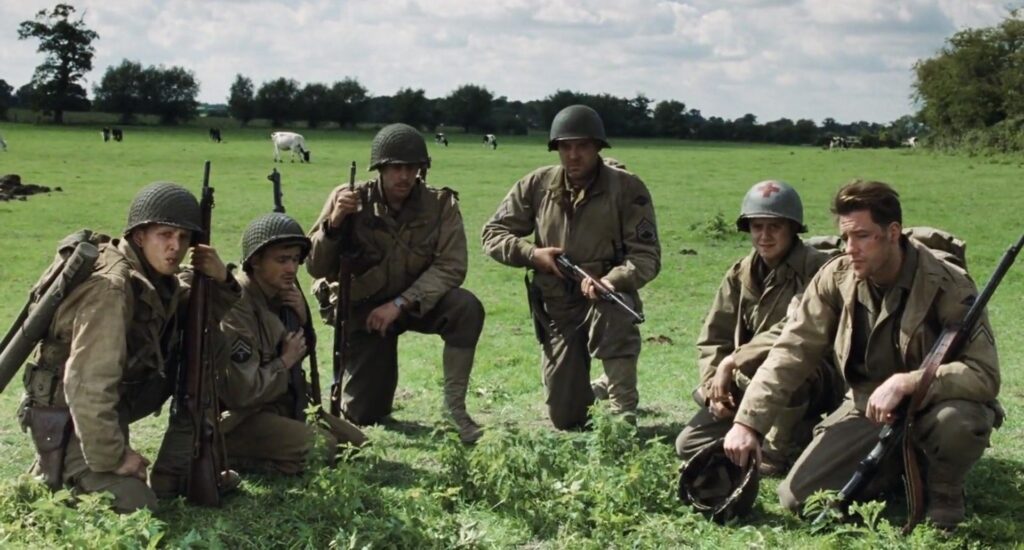 The squad reaches a rallying point where they question wounded soldiers. Searching through fallen soldiers’ dog tags, they are met with quiet condemnation from passing paratroopers. Finally, a deafened soldier tells them that Ryan was reassigned to defend a critical bridge in Ramelle.